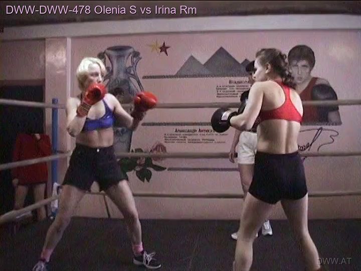Boxing match in a ring between Olenia S. and Irina Rm., wearing proper boxing outfits. This match ends with a TKO after a strong direct punch to the face !