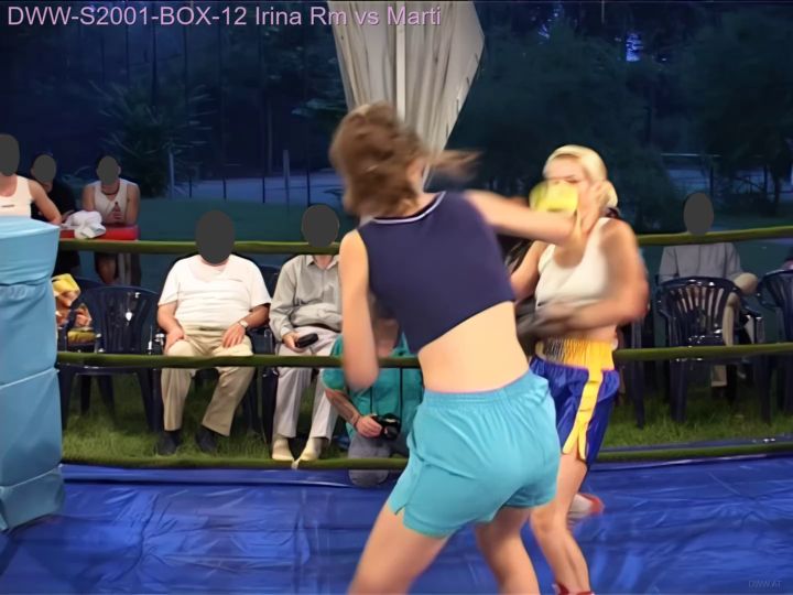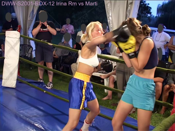 This is a boxing match from our Summer Event 2001. Pro boxing over 5 rounds of 2 minutes, in boxing attire. Marti is a boxeur from a local boxing club in Hungary. Irina Rm is one of our regular fighters from Ukraine and she is part of the BSA team. In the third round one girl cannot continue and she retires from the fight.